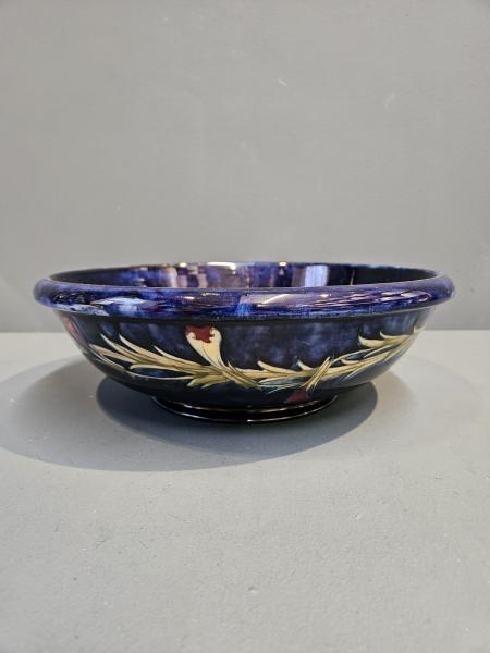 A large 13" diameter Moorcroft pansy pattern bowl with decoration to the inside and outside of the bowl, signed William Moorcroft c.1919. Broad base and curved sides with rolled rim to the top and small foot to the base. The interior of the bowl decorated with a large tube lined pansy set against leaves and buds. The flower painted in a deep purple with soft green leaves and yellow buds against a deep blue background. The exterior of the bowl decorated with a continuous band of tube lined pansy buds painted to match the interior, set against a blue background. Signed in full to the base with William Moorcrofts signature in green along with Moorcroft factory impressions indicating a date of manufacture of c.1915-19. Presented in immaculate perfect condition with no damage or repairs. Measures 13" diameter x 4.25" high. Stock number 42629.