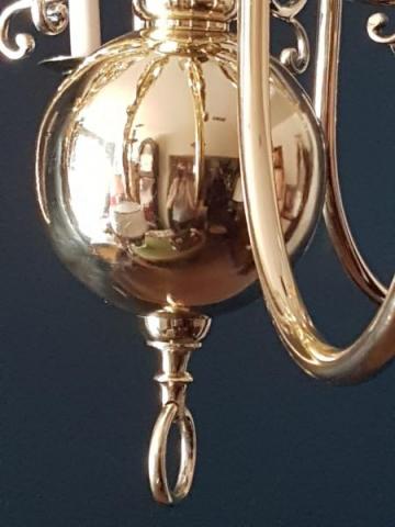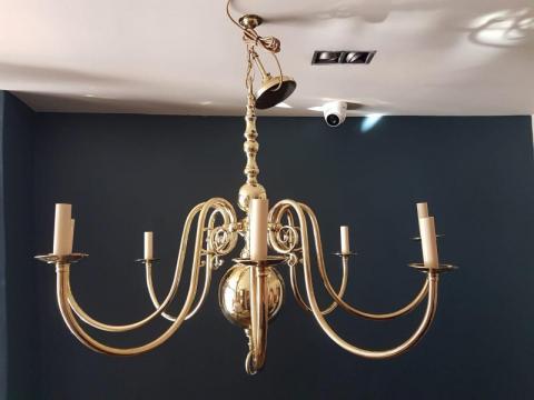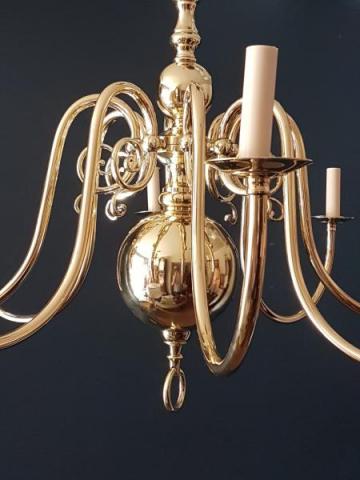 A Large Edwardian antique cast brass 8 arm chandelier.c.1910. Simple wide span swept arms running to a turned centre with decorative sphere to the base. Cast fittings throughout. Candle holder fittings taking SES bulbs. Polished laqurered and rewired. Including the original ceiling roses,chain and 1m of flex. Measures 38" wide x 38"drop( minimum, but can have extended chain fitted for lower hanging on high ceilings)