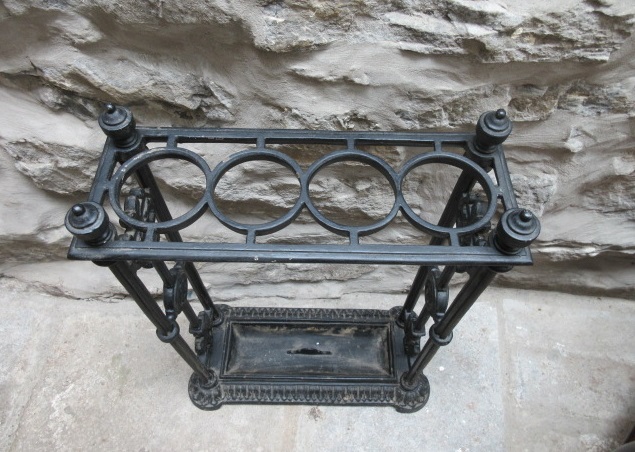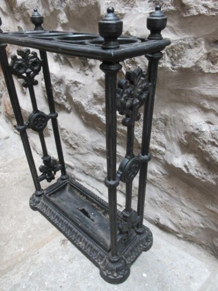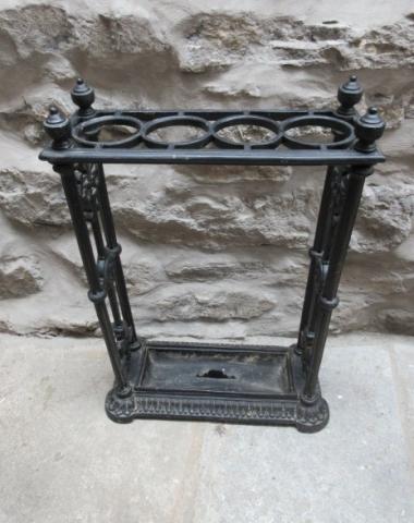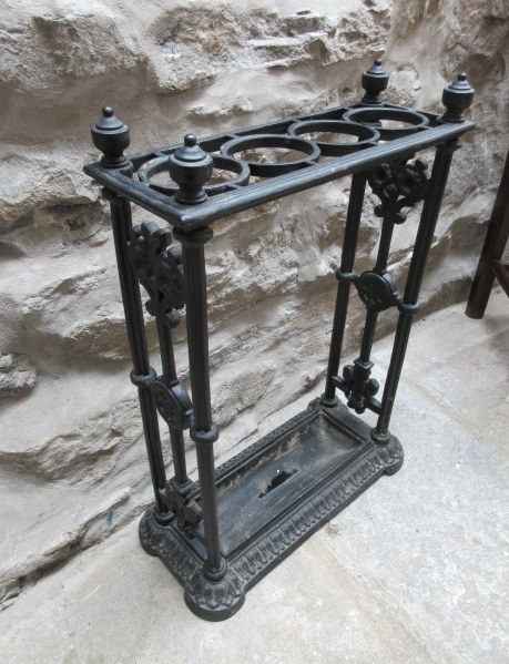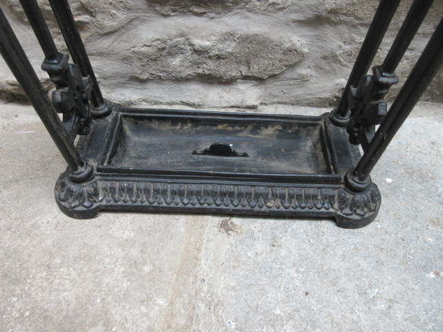 A Late 19th Century antique cast iron stick stand.c.1880. Ringed holders to the top. Decorative supports to the sides. Removable drip tray to the shaped base. Nice compact size. Firm, heavy and no breaks. Measures 18" x 8"deep x 25"high. Stock no.33001