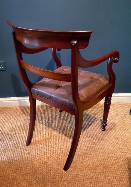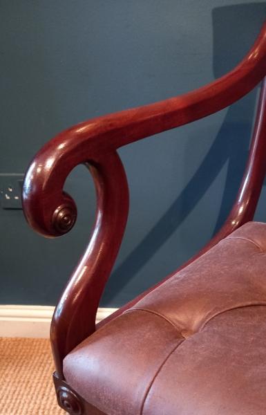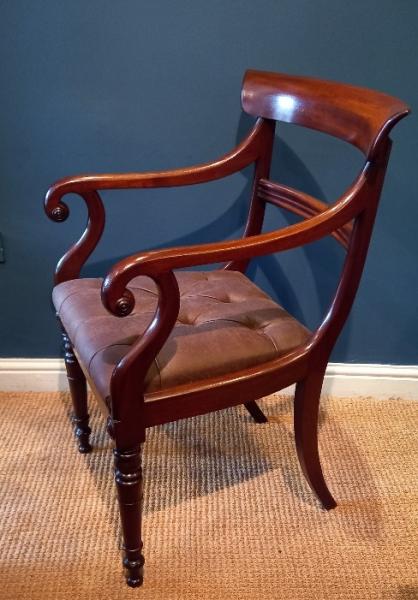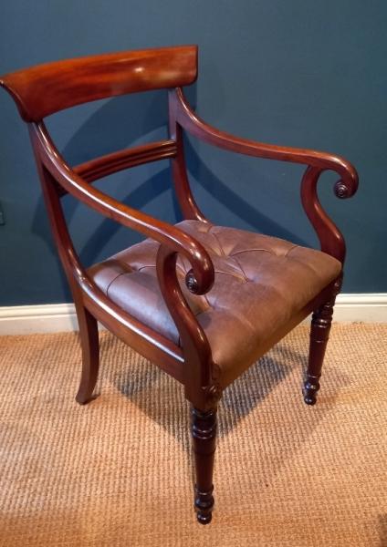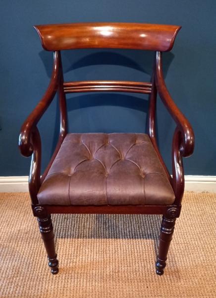 A Late Regency period mahogany carver armchair.c.1830. Scroll arm supports and plain shaped back rest. Drop in deep buttoned seat reupholstered in brown hide. Turned leg supports and splayed back legs. Ideal as a desk chair. Superb patina and condition. Measures 21" x 25" deep x 36" high. Stock no.38048