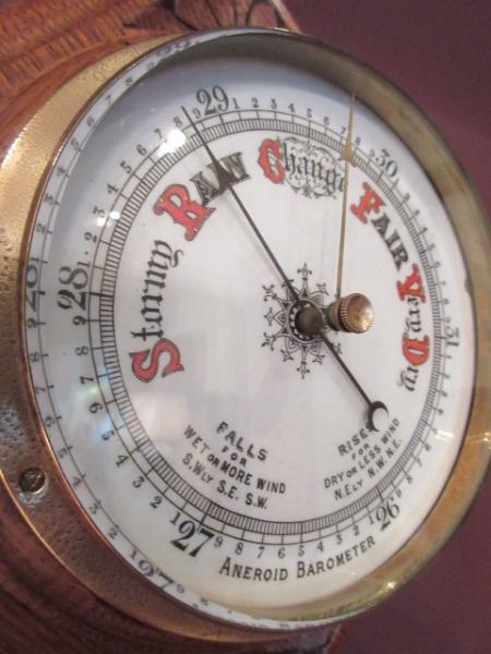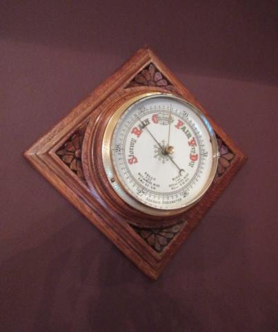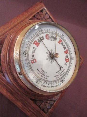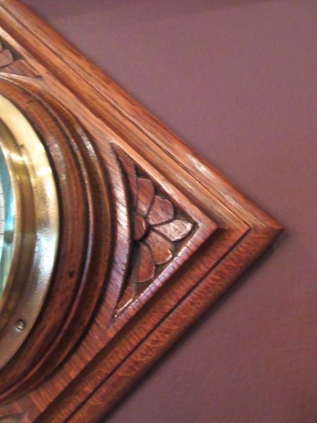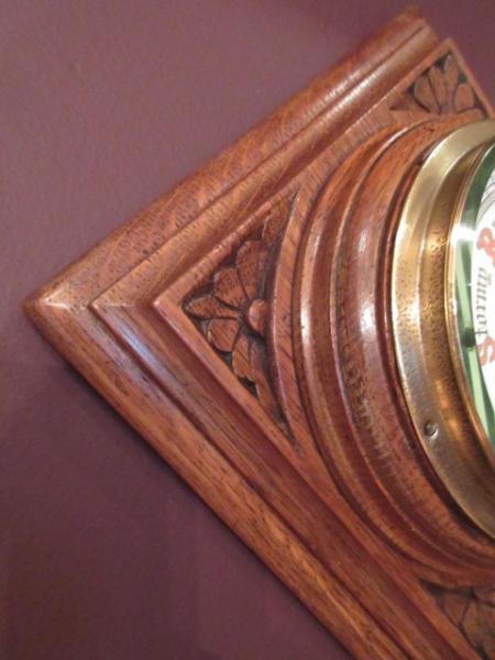 A Mid Victorian antique polished oak diamond shaped barometer.c.1880. Porcelain dial and brass bezel surround. Carved decoration to the corners of the case. Full working order. Measures 8" x 8" x 3"deep.