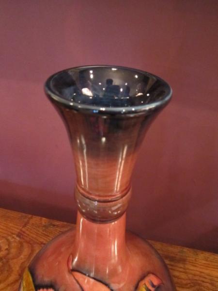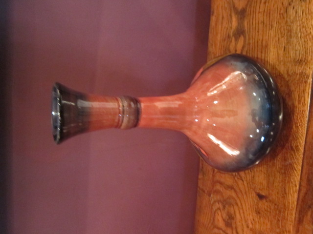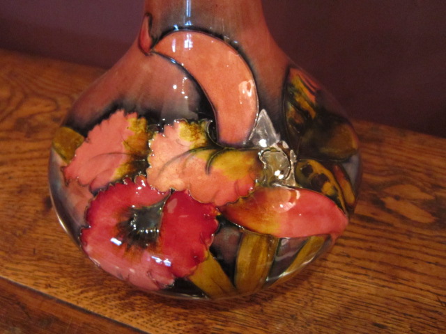 A Moorcroft flambe glazed Slipper Orchid vase. Signed William Moorcroft and stamped 'Potter to the Queen'.c.1928-36. Exhibition hole to the base. Measures 8" diameter x 13"high.Stock no.25270.