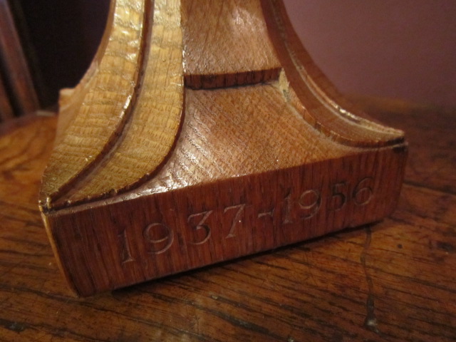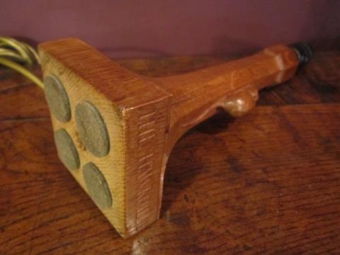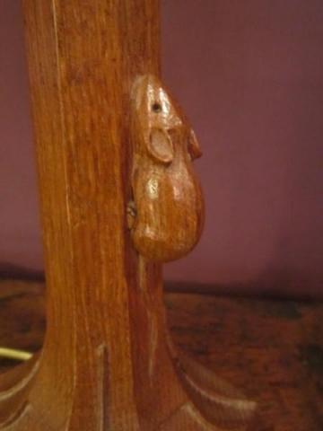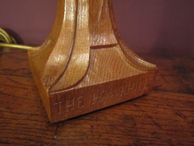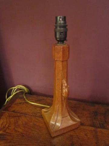 An Old Mouseman azed oak table lamp made by Robert Thompson of Kilburn. Nicely carved mouse to the support. Carved 'The Hawkins' 1937-56 to the base. From a local private house. Superb colour and patina. Measures 3.75"square x 12.5"high. Stock no.27125.