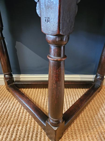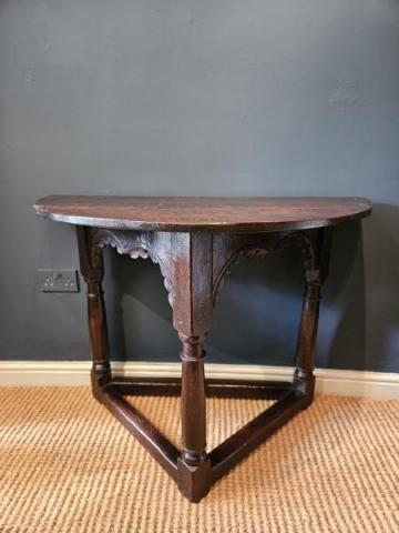 An unusual period oak side or serving table with turned baluster shaped legs and superb carved arched apron c.1690. Planked half round top sat over a triangular base. Carved arched top rails with scalloped edge forming a deep apron. Baluster shaped legs supporting base strechers, with the owners initials stamped to the top of one leg. Pegged top and joints, superb colour and rich patination throughout; origins probably South Wales. Measures 42" maximum width x 20.5" deep x 31" high. Stock number CS403.