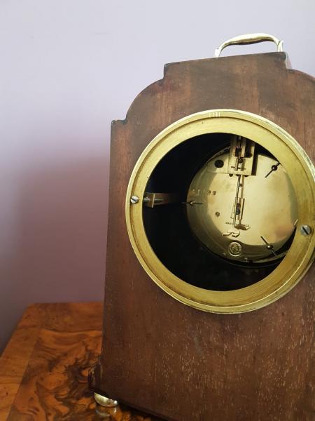 A Top quality Edwardian period antique inlaid figured mahogany 8 day mantle clock in the style of a Regency bracket clock. c.1900. White porcelain convex dial behind bevel edge glass with brass bezel. French movement fully overhauled. Ebony strung case with shaped top and decorative brass carry handle to the top. Measures 9" tall. x 4.5" deep. x 6" wide. Stock number 32860