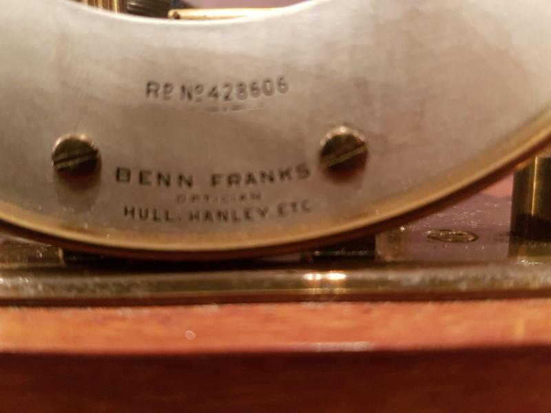 A quality Edwardian period mahogany cased barograph with barometer dial and chart drawer to the base. c.1915. The 8 day movement with original finish and constant reading silvered barometer dial to the face. Bears the makers mark for Benn Franks. Polished mahogany case with quarter plate beveled edge glass, chart drawer to the base. Fully overhauled movement. Measures 14" wide x 8.5" deep x 8" high.