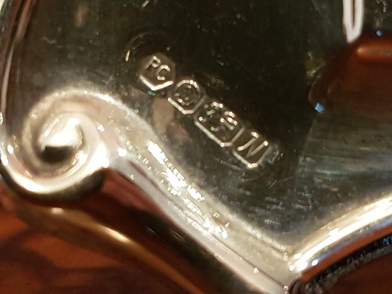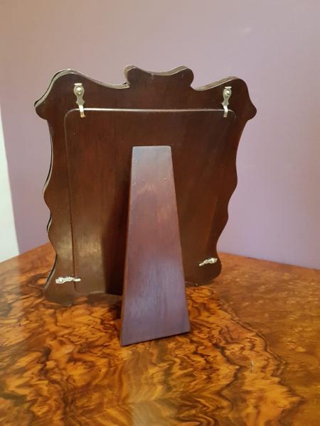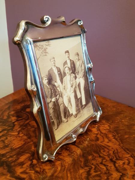 A quality silver photo frame in Art Nouveau style. Sat On a solid polished mahogany back, with firm easel stand. Decorative embossed silver work to the frame with glass picture window. Hallmarked Sheffield 1976. Superb condition. Takes a 6" x 4" photo. Measures 6" wide. x 7.5" tall. Stock number 32754.