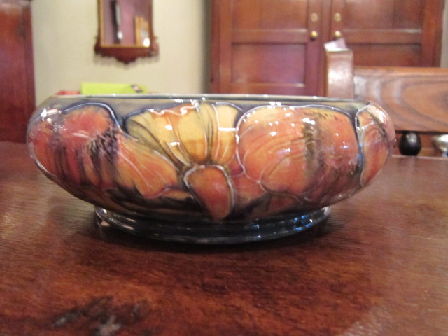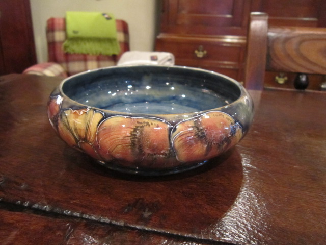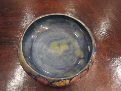 A Rare Early Moorcroft Claremont rolled edge bowl on a green/blue ground made for Liberty's .c.1905.* Decorated to the surround with mushrooms. Signed William Moorcroft to the base. Excellent condition. Measures 7.5"diameter x 2.5"high.