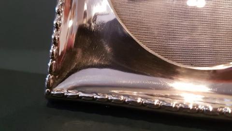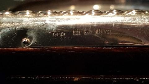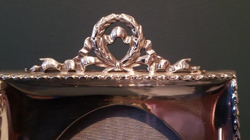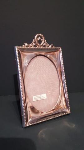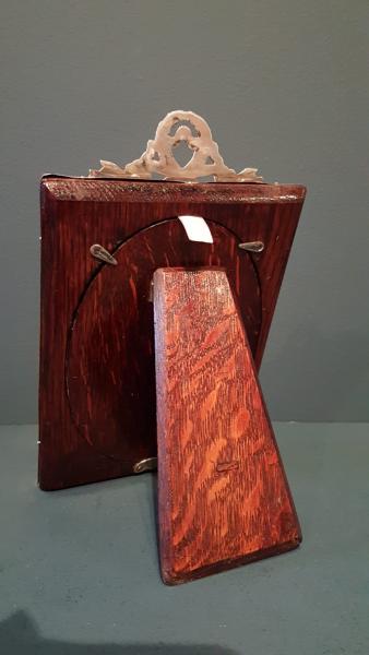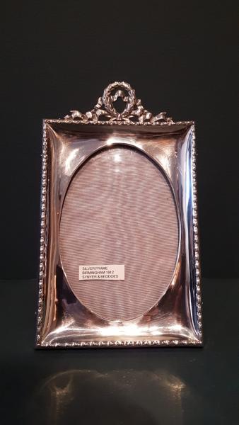A solid silver photo frame with ribbon design crest to the top and oak back, hallmarked Birmingham 1912. The solid silver front with raised embossed outer edge and dished interior, oval picture window to the centre. Cast ribbon design crest to the top, solid oak back with sturdy easel stand. Bear's the makers mark for Sytner & Beddoes. Superior quality and presented in immaculate condition with a deep shine. Measures 5.25" wide x 7.25" high. Takes photo 6" x 4". Stock number 37808.