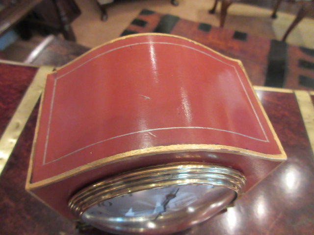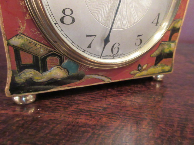 A Small Edwardian lacquered Chinoiserie mantel clock.c.1910. Silvered engine turned convex dial and brass bezel surround. 8 Day French movement in full working order. Gilt hand painted Oriental decoration to the front and sides. Standing on brass bun feet. Excellent condition. Measures only 5" x 3" x 5.25"high.