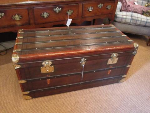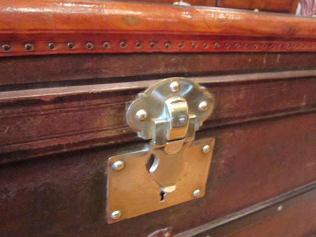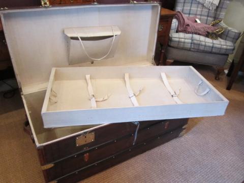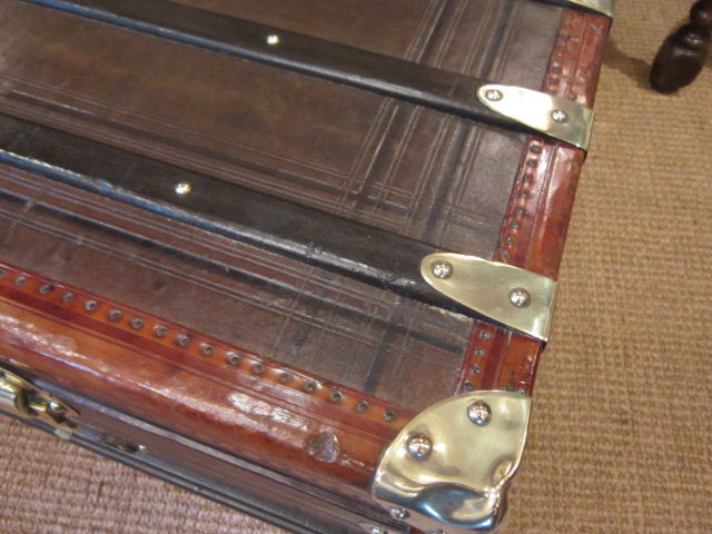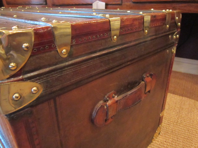 A Stunning Late 19th Century French cabin trunk bound in leather.c.1895. Embossed decoration to the top. Brass and leather bound corners. Original linen lining with a lift out tray. Carry handles to the sides. Beech frame for extra strength. Superb original finish and patination to the leather. Rare to find in this condition. Measures 44" x 20" x 21"high.
