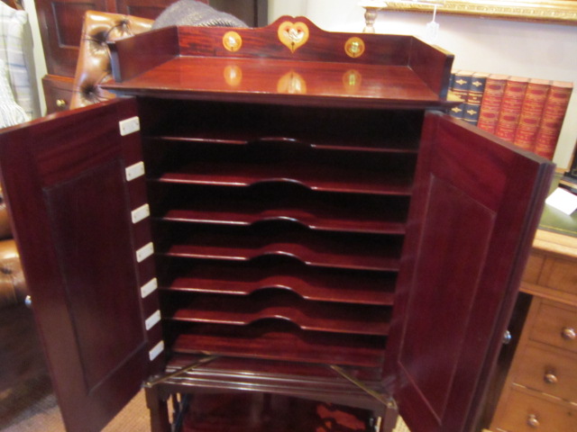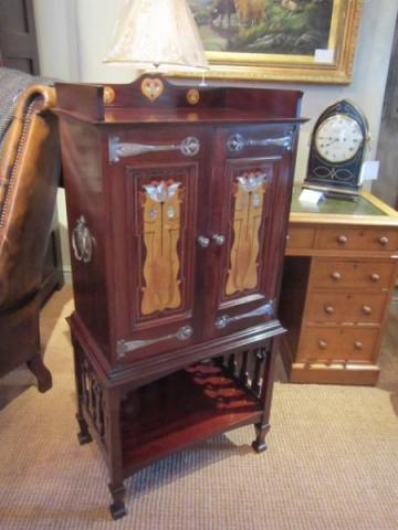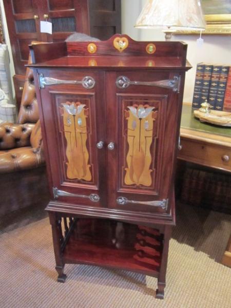 A Stunning Art Nouveau period mahogany inlaid music cabinet made by highly regarded cabinet maker, Shapland & Petter.c.1900. Fruitwood, satinwood and mother of pearl inlays to the double opening doors. Tudoric copper hinges and carry handles to the sides in the manner if Liberty's. Dividers to the interior for sheet music and the original ivory name panels to the sides. Inlaid gallery edge to the top. Tulip shaped frets to the under tier. Superb condition, colour and patina. Measures 22" x 14" x 48"high.