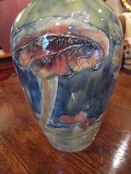 A Stunning Moorcroft Liberty's Claremont large vase. Signed William Moorcroft to the base and stamped Liberty's. Registered no.420081.c.1912. Five large toadstools and ten small toadstools. On a green ground with blue background. Yellow hints to the finish, no runs. Excellent condition. Measures 6"diameter x 13.25"high. Stock no.26474.