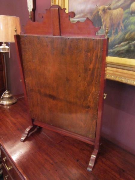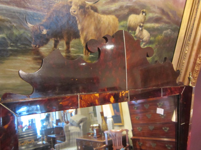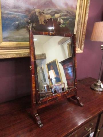 A Superb 1920's tortoiseshell veneered toilet mirror in George III style. Scalloped shaped top to the swing mirror. Ivory inlay sections throughout. Original mirror glass and brass fittings. Standing on shaped feet. Mahogany backing and construction. Measures 18"wide x 9"deep x 29"high. Stock no.25453.