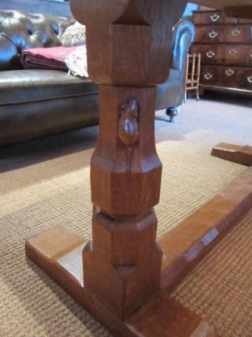A Superb 1950's Thompson of Kilburn Mouseman azed oak dining table on a trestle base. Six matching panelled back dining chairs each bearing the trademark carved mouse to the legs. Original leather seats. Superb colour and patina. Table measures 72"long x 34" x 29"high. Chairs measure 17" x 15"deep x 33"high, seats 18"high. Stock no.25434.