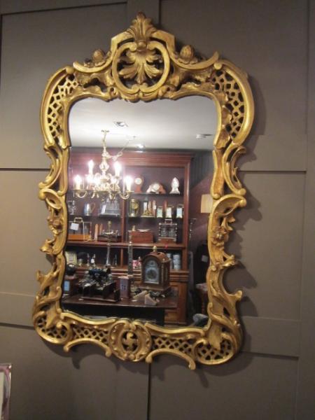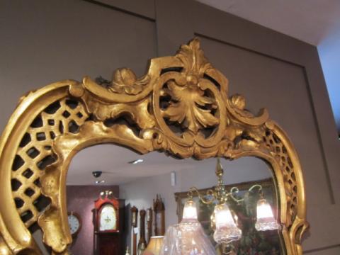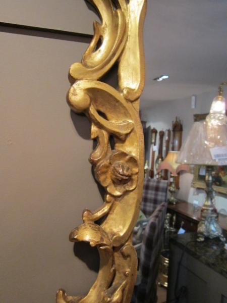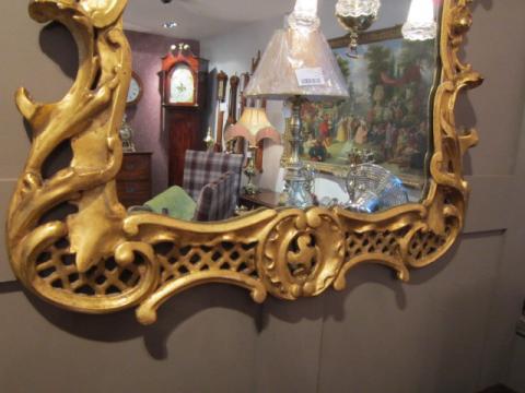 A Superb Early Victorian timber gilt Rococo style wall mirror.c.1840. Original mirror glass. Scalloped shaped sides with foliage decoration. Fretwork to the top and base. Measures 26" x 40" x 2"deep.