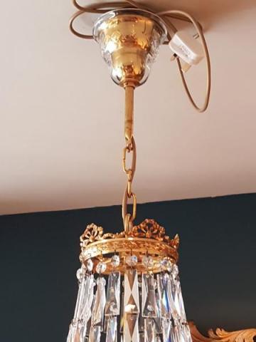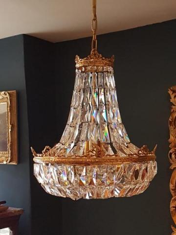 A Superb Edwardian period antique cut crystal and decorative gilt bronze framed chandelier c.1910. Decorative gilt crown to the top, supporting runs of cut crystal adjoining the central crown. Matching runs of crystal sweeping under to a decorative central boss underneath. Original brass and cut crystal ceiling mount. Four bulb fitting to the interior, fully restored and rewired. Measures 31" drop x 14" wide.