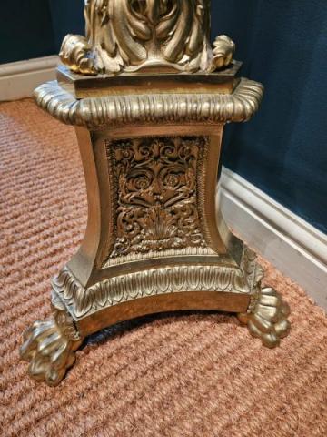 A superb quality Edwardian cast gilt brass lamp standard with wonderful detail and original gilt finish, cleaned and rewired ready for use c.1910. The weighted cast foot with fretted floral decoration to all three sides, plus acanthus leaf border to the base with claw feet set to all three corners. Acanthus leaf overlays with flared tips to the tall reeded column and cast flared mount to the top, which has an acanthus leaf mount to the base and beaded top edge. Candle style column to the top with brass switched lamp holder above. A superb quality stylish statement piece with excellent original gilt finish to the heavy brass construction. Cleaned and rewired ready for use. Measures 14" wide x 14" deep at the foot x 2.5" column diameter x 70" high. Stock number 42428.