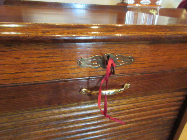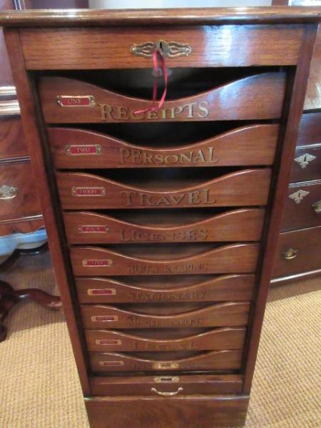 A Superb Edwardian period polished oak filing cabinet.c.1910. Nine pull out trays with sign written fronts and brass tabs. Each suitable for A4 size paper. Tambour front with working lock and key. Moulded edge top and fielded panel sides. Superb colour and condition. Measures 19" x 16"deep x 41"high.