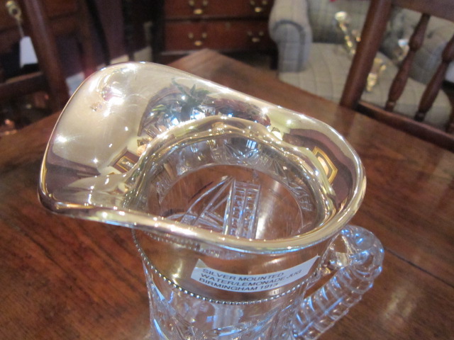 A Superb George V solid silver mounted and cut glass lemonade jug. Hallmarked Birmingham 1913. Crystal cut glass body and shaped handle. Beaded edge silver mount and pourer to the top. Superb quality and condition. Very heavy. Measures 4" diameter base x 10.5"high, 6"wide at the top. Stock no.27207.