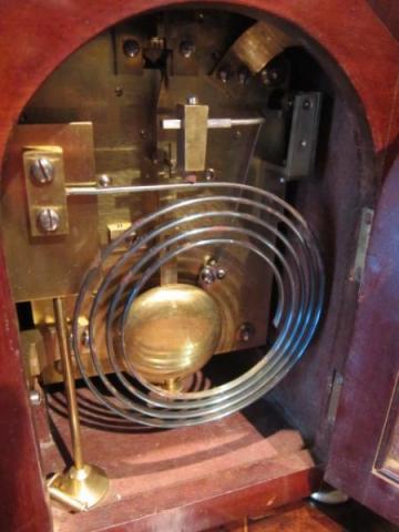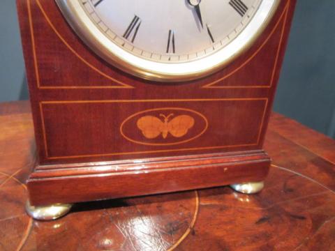 A Superb Late 19th Century mahogany cased double fuse bracket clock of small proportions. Silvered engraved convex dial and brass bezel surround. 8 Day chain driven movement striking on the hour and half to a gong. Fruitwood inlay and brass fittings to the shaped top case. Made by Penlington & Batty of Liverpool. c.1890. Top quality. Fully overhauled. Measures 7.5"wide x 4"deep x 7.5"high. Stock no.26424.