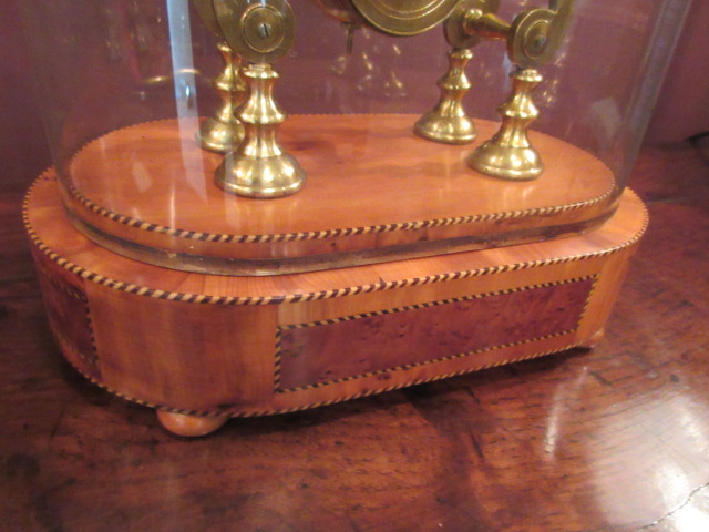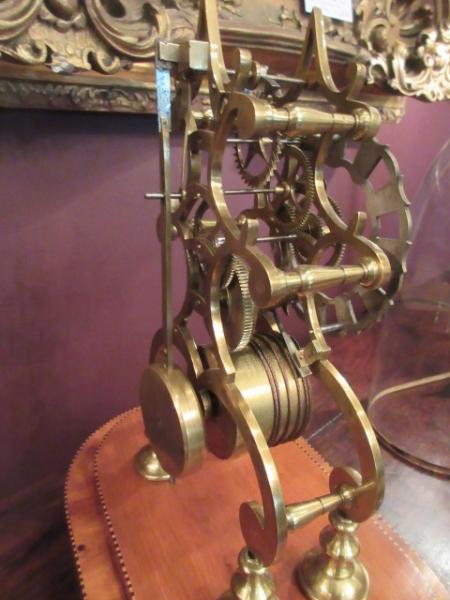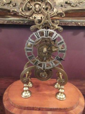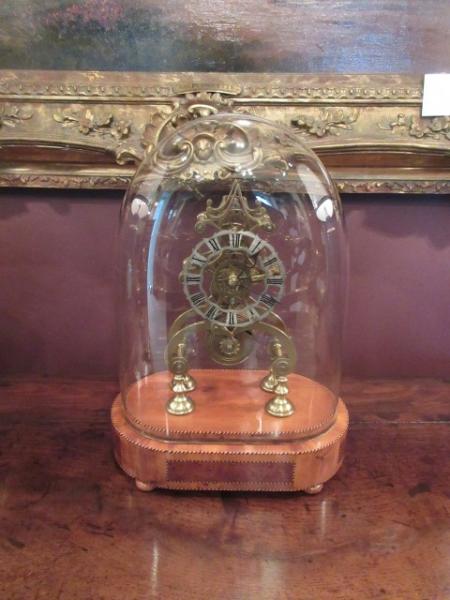 A Superb Mid Victorian single fusee skeleton clock.c.1870. Six pillars to the 8 Day chain driven movement. Silvered pierced dial. Sat on a burr yew inlaid base and bun feet. Complete with the original glass dome. Full working order. Measures 11" x 6.5"deep x 16.5"high. Stock no.32981.