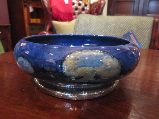 A Superb Moorcroft 'Moonlit Blue' pattern rimmed bowl on a pewter 'Tudoric' base. Made for Liberty's. Decorated to the inside with three trees in landscape. Eight trees decorated to the surround. Stamped Moorcroft to the base. Measures 8.5"diameter x 3.25"high. Stock no.26752.