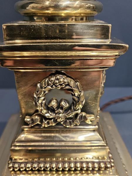 A superb quality Edwardian solid brass Corinthian column table lamp with heavy base, fully rewired and ready for use c.1910. Stepped brass base with cast iron inner weight to aid stability, wreath design decoration to the base of the reeded column, plus Corinthian mount to the column top. Polished and fully rewired with brass switched lamp holder and 2 meter of silk covered cable with fitted plug. Presented in immaculate condition with a deep shine. Measures 6.75" square at the base x 23.5" high. Stock number 42567.