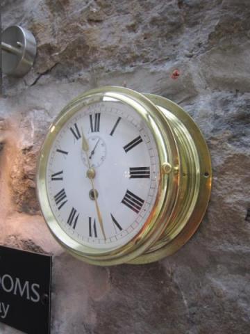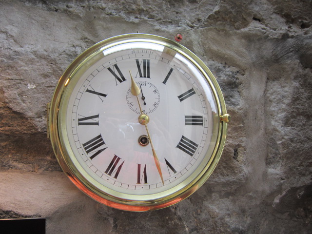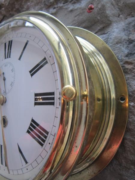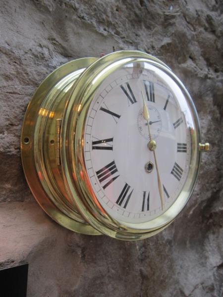 A Superb Mid Victorian polished brass ships clock.c.1880. Rare convex enamel dial with seconds aperture and original brass hands. Convex bevelled edge glass front. 8 Day platform escapement. Fully overhauled. Measures 8.5"wide overall x 3.5"deep.