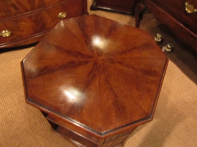 A Superb Victorian figured mahogany revolving low book table.c.1880. Sun burst veneered top. Mock leather bound books to the corners. Standing on turned bun feet. Adjustable shelves to each side. Measures 24"square x 24"high. Stock no.28457.