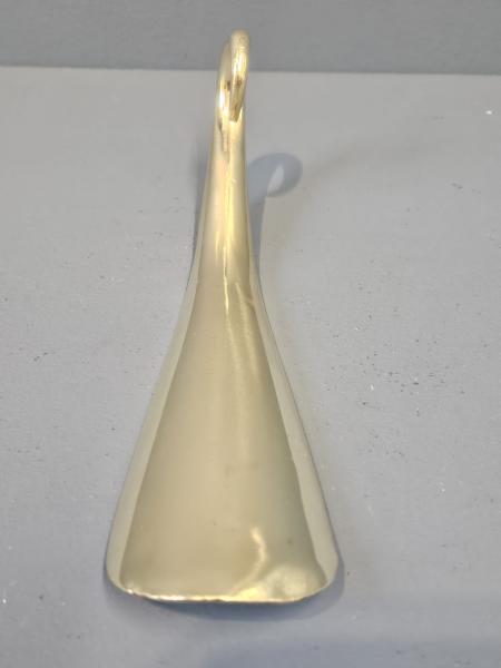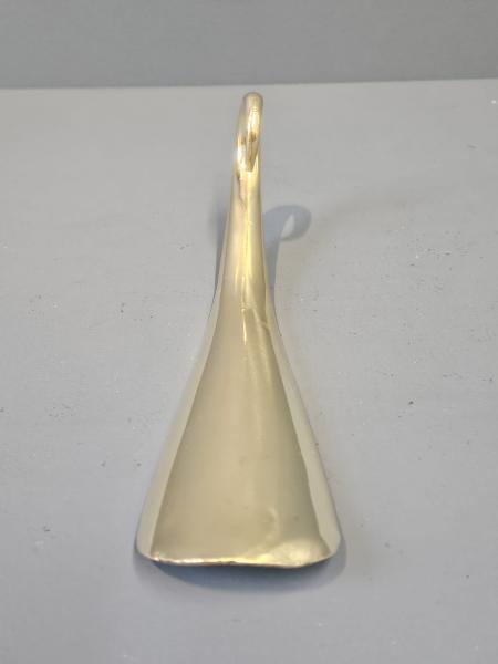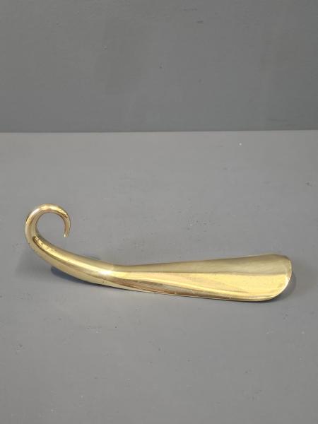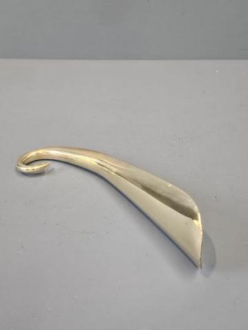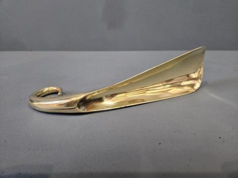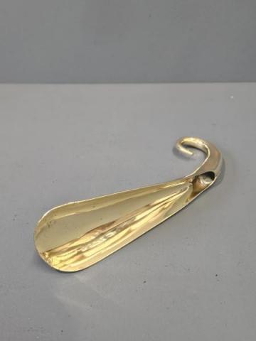 A brass shoe horn with polished finish. Dished form with rounded base for putting a shoe on, slightly curved form with tighter curve to top forming a hand pull or hanging loop. Presented in immaculate condition with a deep shine. Measures TBC. Stock number