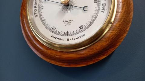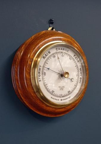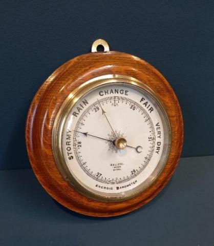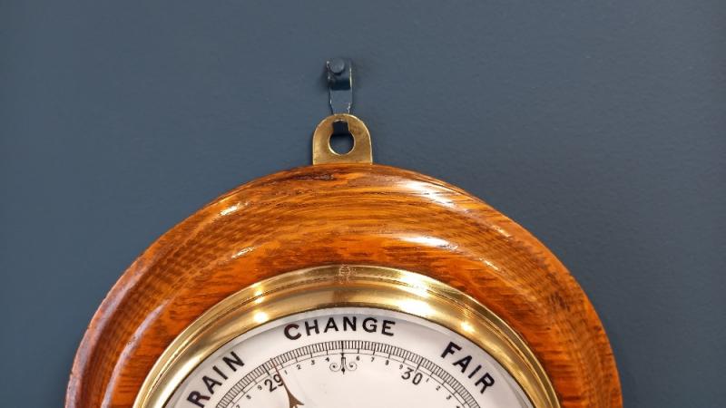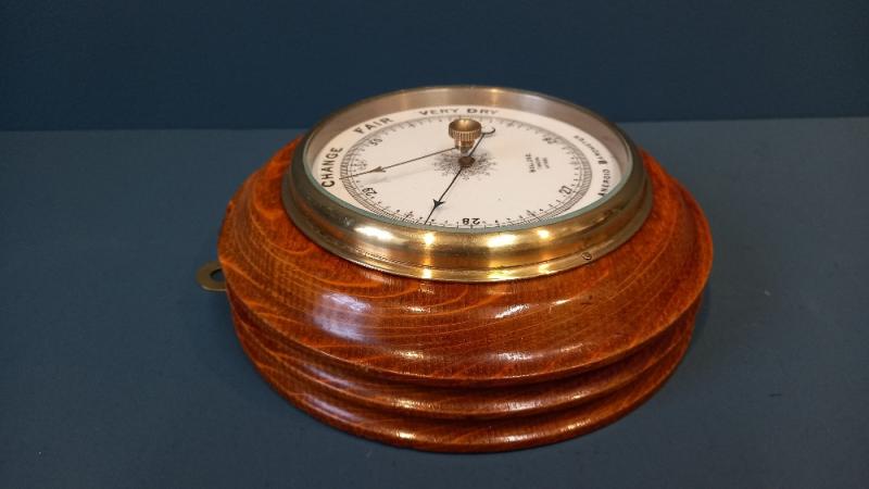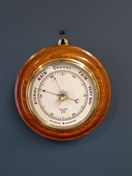 A late Victorian oak & porcelain dial Dolland of London barometer c.1890. Golden oak turned case with reeded surround and porcelain dial bearing the maker's name and numbered 7585. Brass bezel with glazed inset and centre reading marker. Fully serviced with superb golden oak colour. Measures 7.75" diameter x 8.5" high including handing plate x 2.25" deep. Stock number 39318.