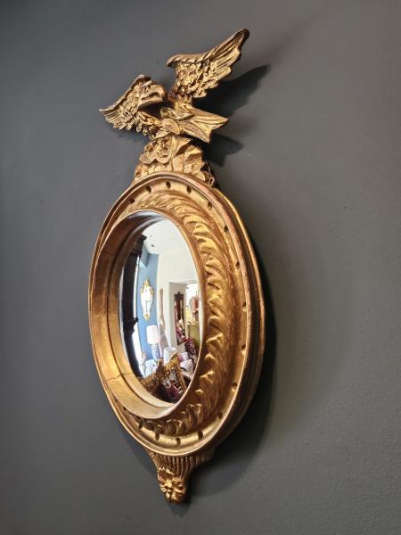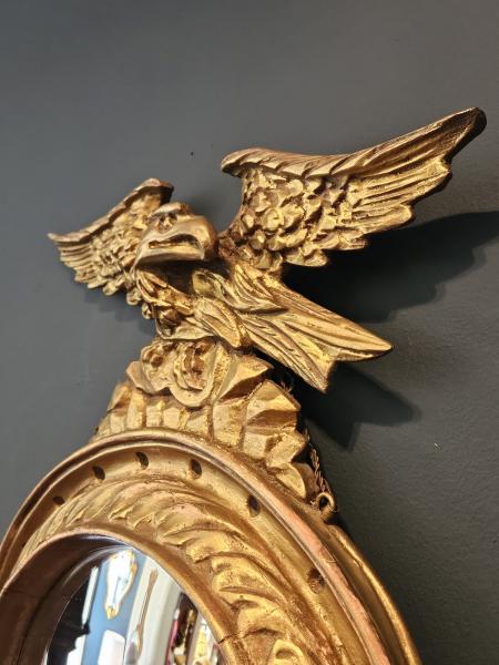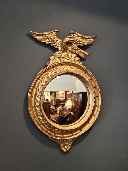 A Victorian period timber gilt framed convex mirror with original pediment, apron and gilt finish c.1880. Dished circular frame with decorative moulding to the inner edges. Original leaf work pediment to the top with eagle sat to the centre and complementing leaf work apron to the base. Convex mirror glass in good condition along with an original patinated gilt finish to the frame and original boarded back with secure fittings for wall hanging. Presented in good condition. Measures 14" frame width x 2" frame depth x 23" high including pediment and apron. Stock number 43315.