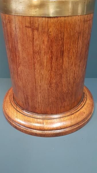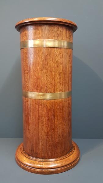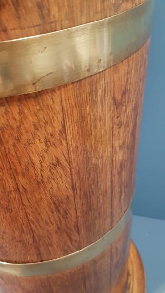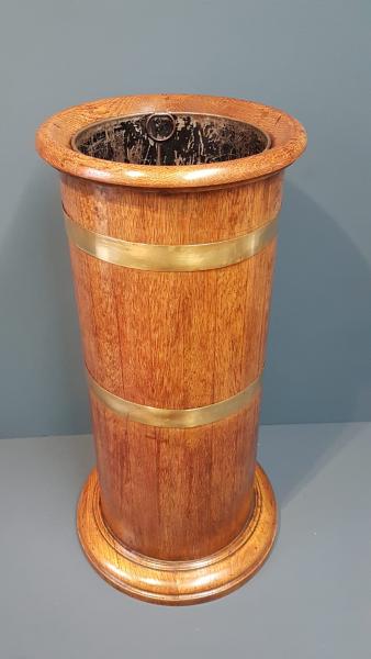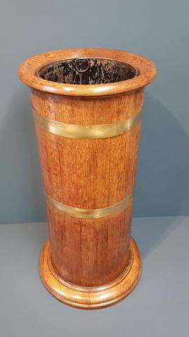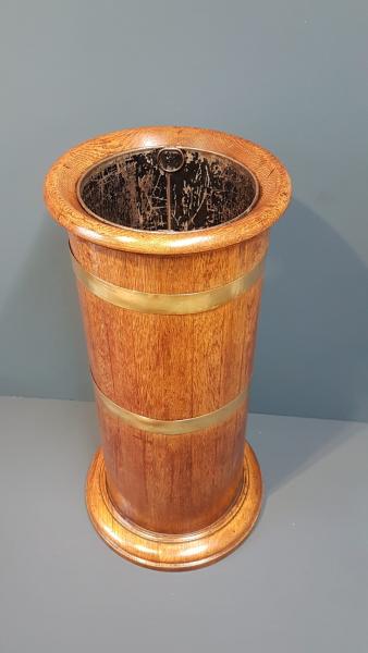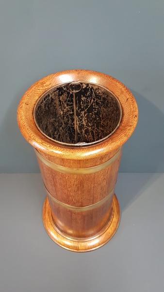 A superb Victorian antique oak and brass bound country house stick stand and liner c.1880. Polished oak sides formed with small planks rounded edge moulded rim to the top and matching moulded stepped base; two brass bound rings to the centre section. Original removable lining to the interior. Presented in excellent condition with a superb rich colour and patina. Measures 26" high x 11.75" diameter. Stock number 40136.