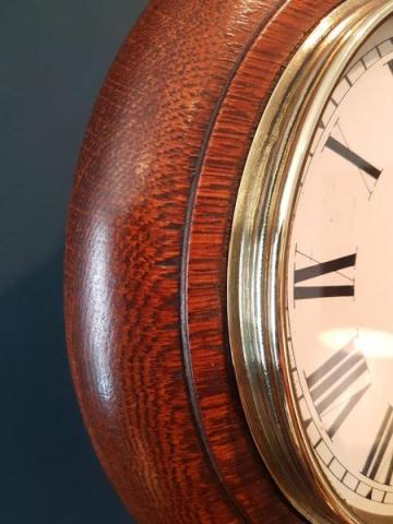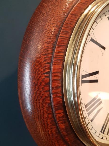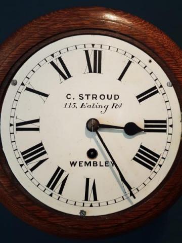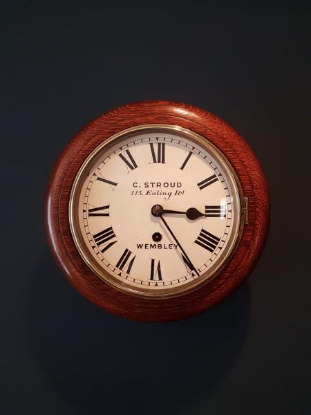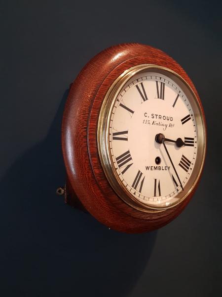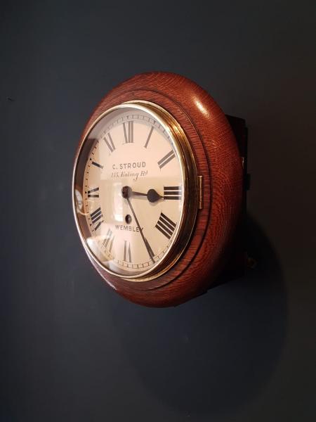 A superior quality 8" dial late Victorian solid oak cased 8 day English dial clock in full working order c.1890. Figured timber moulded edge dial surround with matching back box, access doors to the base and side. Polished brass bezel with glazed view window forming the door covering the original painted 8" dial with Roman numerals and blued steel hands. Bears the makers name Stroud, 115 Ealing Road, Wembley. The high quality 8 day sprung driven movement with heavy plates and anchor escapement, fully serviced and working. Presented in superb original condition with a deep shine. 11" diameter x 6" deep. Stock number 38298.