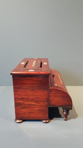 An unusual Victorian rosewood and mother of pearl inlaid stationary and letter box in the form of a piano c.1860. The rosewood veneered exterior with decorative mother of pearl inlays, with a rounded front resembling a piano lid with pen and ink divisions behind. The lid to the top with slots marked for letters, notes and calling cards. The lid lifting to reveal a fitted interior with divisions to hold the papers in place. An unusual item presented in superb condition with a rich colour and original patina. Measures 9.5" wide x 7.5" deep x 7" high.  Stock number 39904.