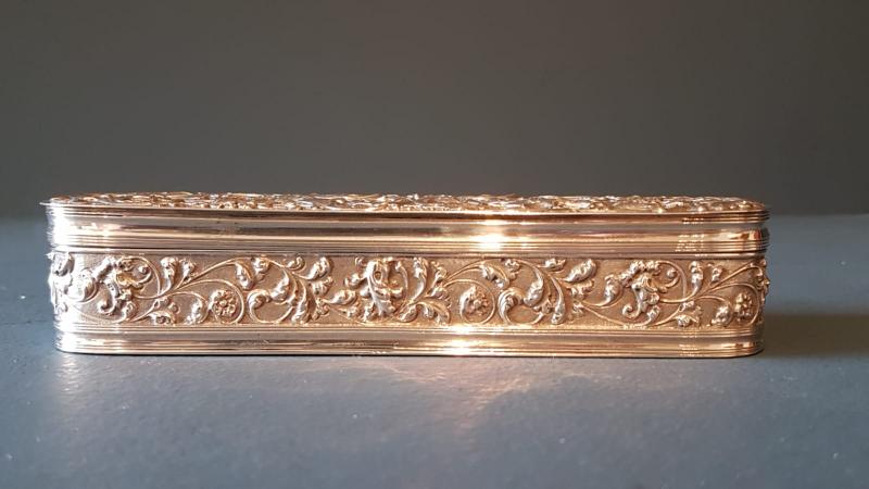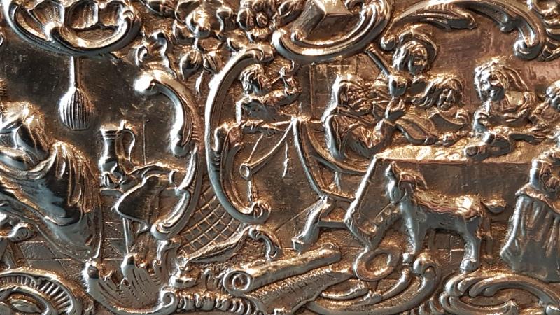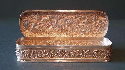 A fine heavy quality solid silver table box with superb embossed decoration c.1885. Oblong form with rounded corners the hinged lid with superbly detailed embossed country scene draped with trees. The base with a continuous band of complimenting floral decoration. The hinged lid with locking hinges opening to reveal a clean interior, bears Hanau silver mark to the base and 925 mark. Presented in immaculate condition with a deep shine. Measures 6.25" long x 2.2" deep x 1.15" high. Stock number 38673.