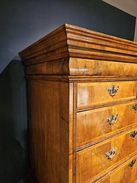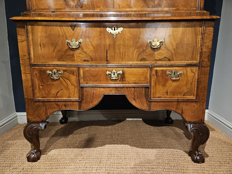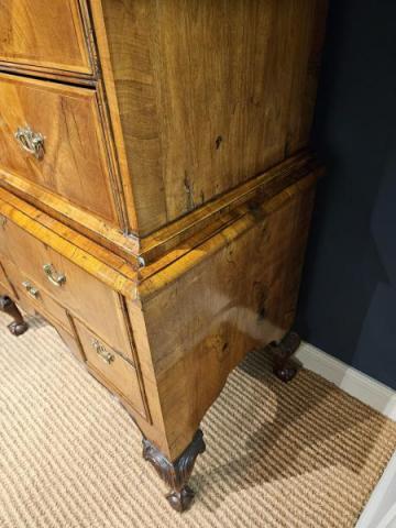 A stylish George I walnut chest on stand with wonderful colour and polish c.1725.  Broad stepped cornice to the top with moulded front shallow drawer concealed below. Two over three drawers below each with book matched figured walnut veneers and herringbone banded edges; double moulded framework sat in between. Stepped moulded waist sat below, the base with one large drawer and three smaller sat over the swept apron, veneers and banding to match the top. Carved decoration to the cabriole legs with claw and ball feet, the legs repeated to the rear; figured walnut veneers to the sides. Excellent colour and polish throughout, presented in superb condition.  Measures 43" wide x 24" deep at the cornice x 71" high.  Stock number 38357.