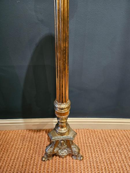 A matching pair of impressive early Victorian brass pricket floor standing candlesticks with original patinated finish c.1850. Decorative triangular bases with masks to each side, decorative band and urn shaped knuckles above, leading to reeded slightly tapering columns. Wide circular drip trays with dental edge and inset pricket for holding the candles. Heavy quality and presented excellent condition with a deep shine. Each measures 10" maximum width x 10" deep at the foot x 7" diameter at the top x 45" high. Stock number 40621.