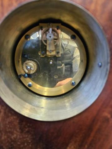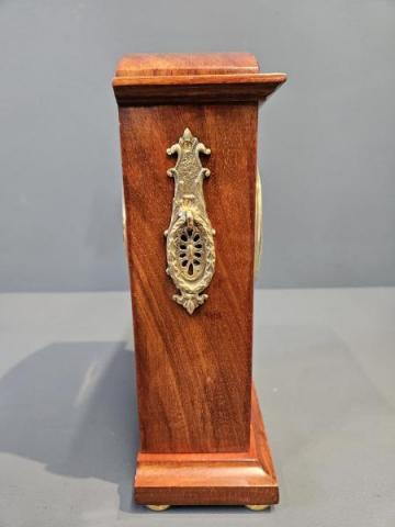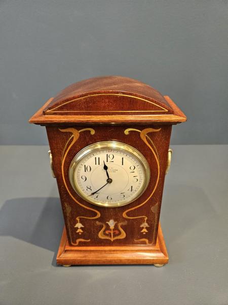 A superb quality Edwardian mahogany 8 day mantel clock with Art Nouveau inlays, fully serviced and working c.1905. The solid figured mahogany case with fruitwood, mother of pearl and brass inlays in the Art Nouveau style; complementing brass drop handles to the sides. Convex porcelain dial with Arabic numerals and blued steel hands set behind a convex bevelled edge glass, which is mounted in a polished brass bezel. The 8 day French movement with platform escapement, fully serviced and working. Presented in immaculate condition with a rich colour and original patina. Measures 6.75" wide x 3.5" deep x 10.5" high. Stock number 41317.