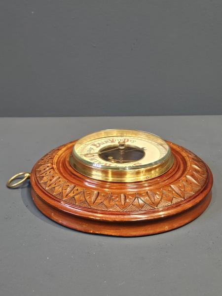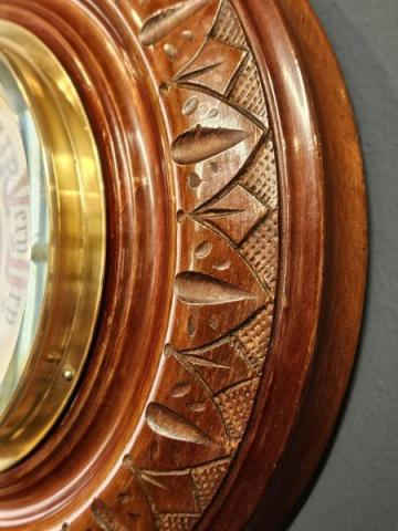 A Victorian turned and carved mahogany cased aneroid barometer with skeletonised movement and porcelain dial, fully serviced and working c.1890. The broad turned mahogany case with carved crest design border and polished brass hanging loop to the top. Skeletonised android movement visible to the centre with porcelain dial sat around the outer edge displaying the weather predictions. Polished brass bezel with bevelled edge glass and central reading marker sat over the top. Presented in immaculate condition with a deep shine, fully serviced and working. Measures 8.5" diameter x 9.25" high including hanging loop x 2" deep. Stock number 42009.