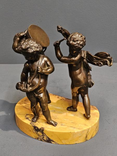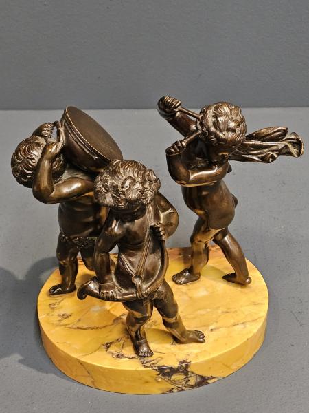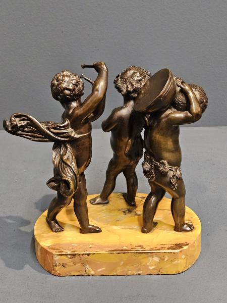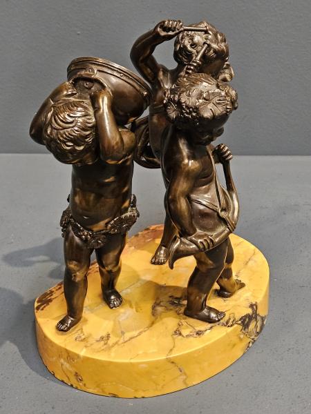 A Victorian bronze figural group of three putti cherubs playing instruments on a marble base with superb patination, after Claude Michel c.1880. Oval golden figured marble base with flat edge to the rear. The bronze cherubs to the surface each in classical form, one holding a horn, another a drum and the other a drum sticks. Superbly detailed throughout with a rich original patination to the bronze and perfect marble base. Base measures 8" wide x 5" deep x 8" high to top figures. Stock number 42371.