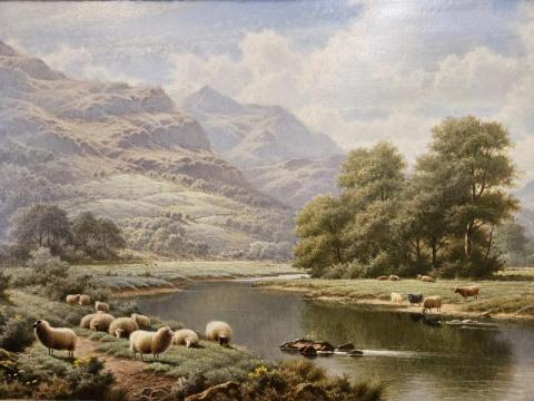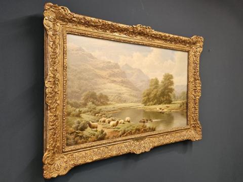 A fine original oil on canvas entitled 'Near Beddgelert, North Wales' by Cheshire born artist Walter J Watson (1879-1979). Superbly painted with a calmness typical of the artist and in a soft colour palette. Set on a summers day with sheep grazing in the foreground by softly flowing waters, trees in full leaf and mountains to the background. Signed by the artist and dated 1913. Walter Watson exhibited at the Royal Cambrian Society in 1910 and 1937 and at Walker art gallery in Liverpool. This example presented in superb condition and sat in the original timber gilt frame. Measures 31.5" wide x 15.5" high including frame. Stock number CS341.