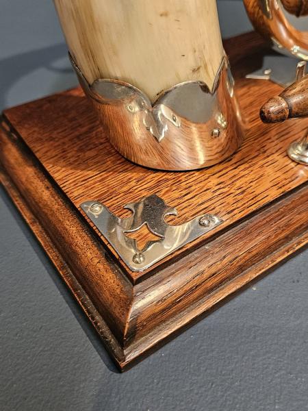 A late Victorian silver plate and cow horn dinner gong with original striker on a golden oak plinth c.1900. Golden figured oak plinth with moulded edge, silver plated mounts to the corners and for the cow horn mount. Matching silver plated tip and scroll design mount to the other end of the horn, which is supporting the original gong. Oak handled striking hammer with leather head to the base sat in silver plated forks. Presented in excellent condition with a deep polish to the silver ware. Measures 14" wide x 6.25" deep at the base x 11" high. Stock number 42527.