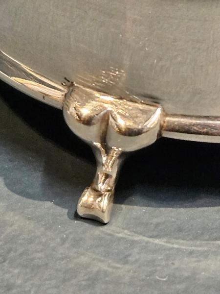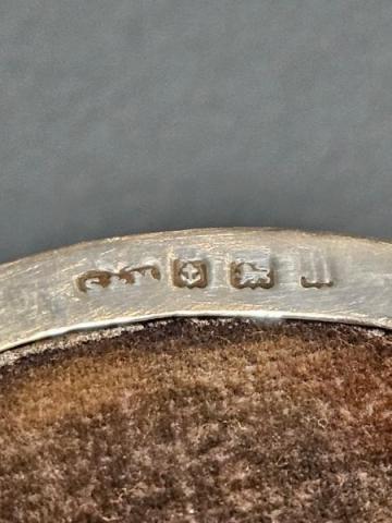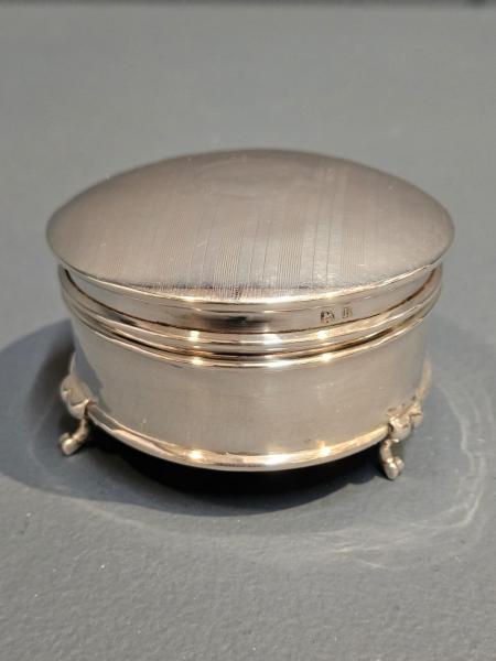 An immaculate George V solid silver trinket or ring box with engine turned finish to the lid and original velvet lined interior; by highly regarded maker Sampson Mordan and hallmarked Birmingham 1912. Circular form with hinged lid, the top with engine turned pin stripe design finish and rolled rim to the edge. Polished sides and small rim to the base with inset feet set to each corner. The hinged lid opening to reveal an immaculate original dark blue silk lined interior. Bears the makers mark for Sampson Mordan along with clear hallmarks to all sections. Presented in immaculate condition. Measures 3" diameter x 2" high. Stock number 42745.
