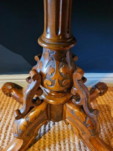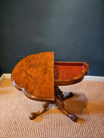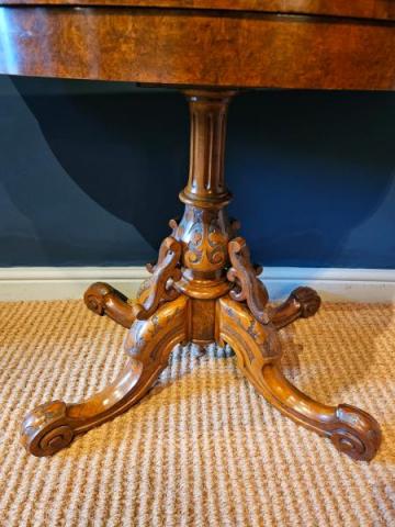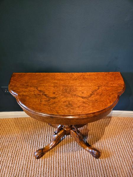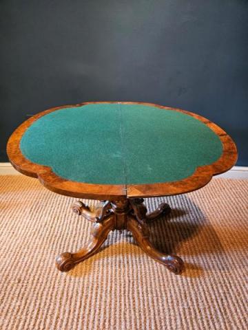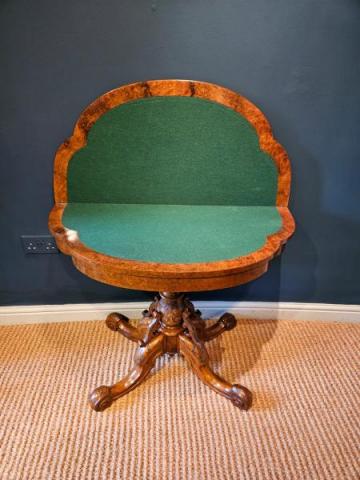 Mid Victorian figured walnut serpentine fronted fold over top games table on a carved tripod foot c.1880. Book matched veneered top with moulded edge and matching burr veneered apron below. The top revolving and opening to make a circular serpentine shaped edge gaming table with green baized centre and figured veneered edge. Sat on a turned and carved pedestal with swept feet, plus carved tops and ends to match the pedestal. Presented in excellent condition with a rich colour and polish. Measures closed 36" wide x 17" deep x 28" high and 36" diameter when open. Stock number 42790.