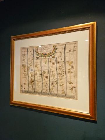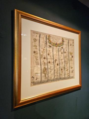A print from a strip map of "The Extended Road from Oakham to Richmond," created by John Ogilby in 1675, c.1800. It is part of the first comprehensive road atlas of England and Wales entitled "Britannia". The original map was engraved on copper plates to allow intricate detail to be added before printing. The map is composed of multiple vertical strips, each representing a segment of the road with detailed illustrations of key landmarks, which is typical of Ogilby's work. This map covers the road from Barnsley to Richmond (Yorkshire), detailing the route through several notable cities such as Halifax. More information on this series of maps can be found on the David Rumsey Map Collection website - click here. Measures 26.5" wide x 23.5" high including frame. Stock number CS371.