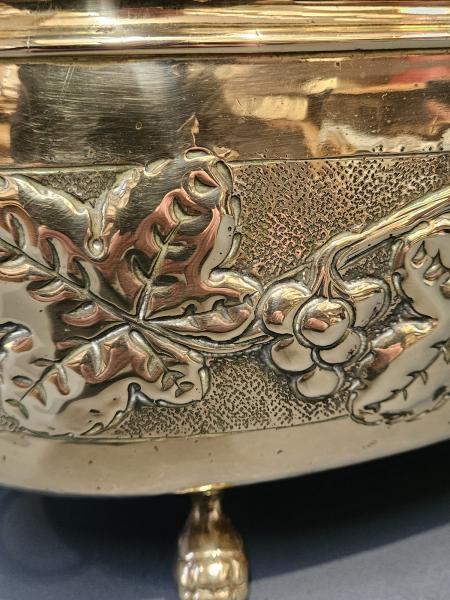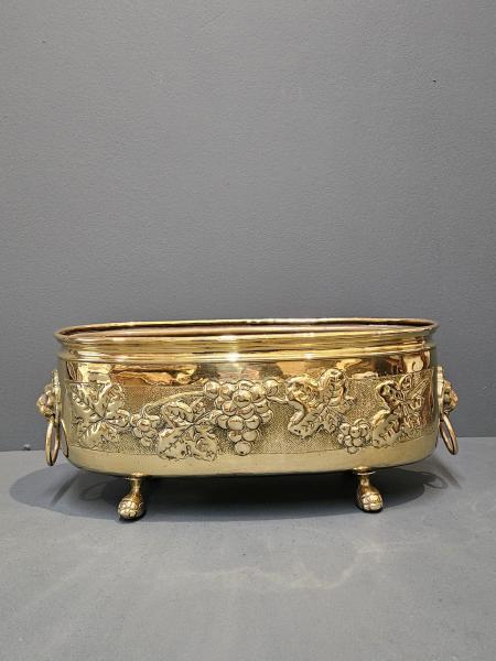 A superior quality Victorian solid embossed brass planter with cast fittings c.1880.  Elongated oval form with with rolled rim to the top and the sides embossed with a decorative grape and vine design border. Cast brass lion mask handles to the sides with ring drops and four complementing ball and claw feet to the base. Heavy quality and presented in immaculate condition with a deep shine. Holds 3 x 5" diameter plant pots and is water tight. Measures 17" long x 6.5" deep x 6.5" high. Stock number 43076.