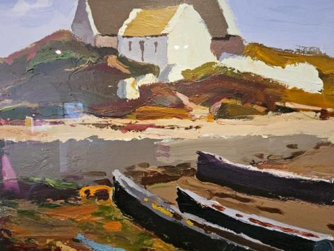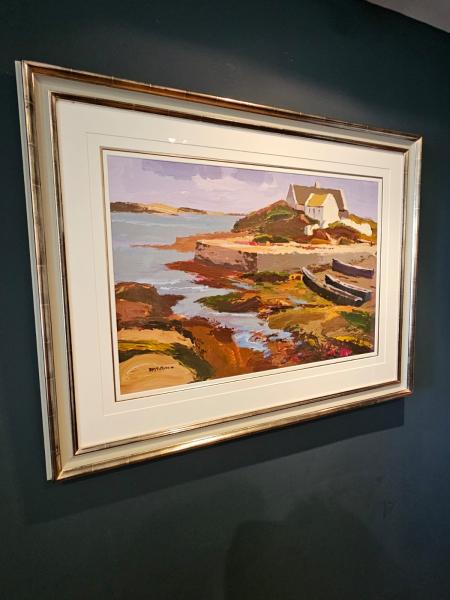 An outstanding acrylic on board by Yorkshire born artist Donald McIntyre 1923- 2009 'Low tide at Dolan'. Superbly painted acrylic on board in typical McIntyre style depicting the low tide at Dolan, County Gallway. Cottages on a rocky mount set above a sandy shore with boats moored in the sand. Superb earthy colours with a deep blue see and mauve sky of a late summers evening depicting a calm scene. The painting with superb depth and impasto bringing it to life. Signed by the artist and in superb condition, presented in a quality timber frame with soft grey and gilt finish along with museum glass. Measures 43" wide x 33.5" high including the frame. Stock number CS376.