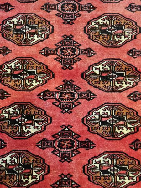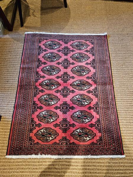 A fine quality Persian pure wool 'Turkmen' rug in superb unworn newly cleaned condition c.1910. The short hand woven pile in deep red is decorated with an interlocking geometric design of small repeated medallions in champagne creams and golds, which are outlined in black. Complementing geometric double border to the rug edge. This design is typical of the Turkmen tribes of central Iran and these rugs were often is used as a wall hangings as well as a floor rugs. Presented in superb unworn stain free condition, newly cleaned ready for use. Measures 50" long x 36" wide. Stock number 43072. TO PURCHASE THIS RUG PLEASE CONTACT THE SHOP VIA THE PHONE NUMBERS PROVIDED ON THIS WEBSITE.